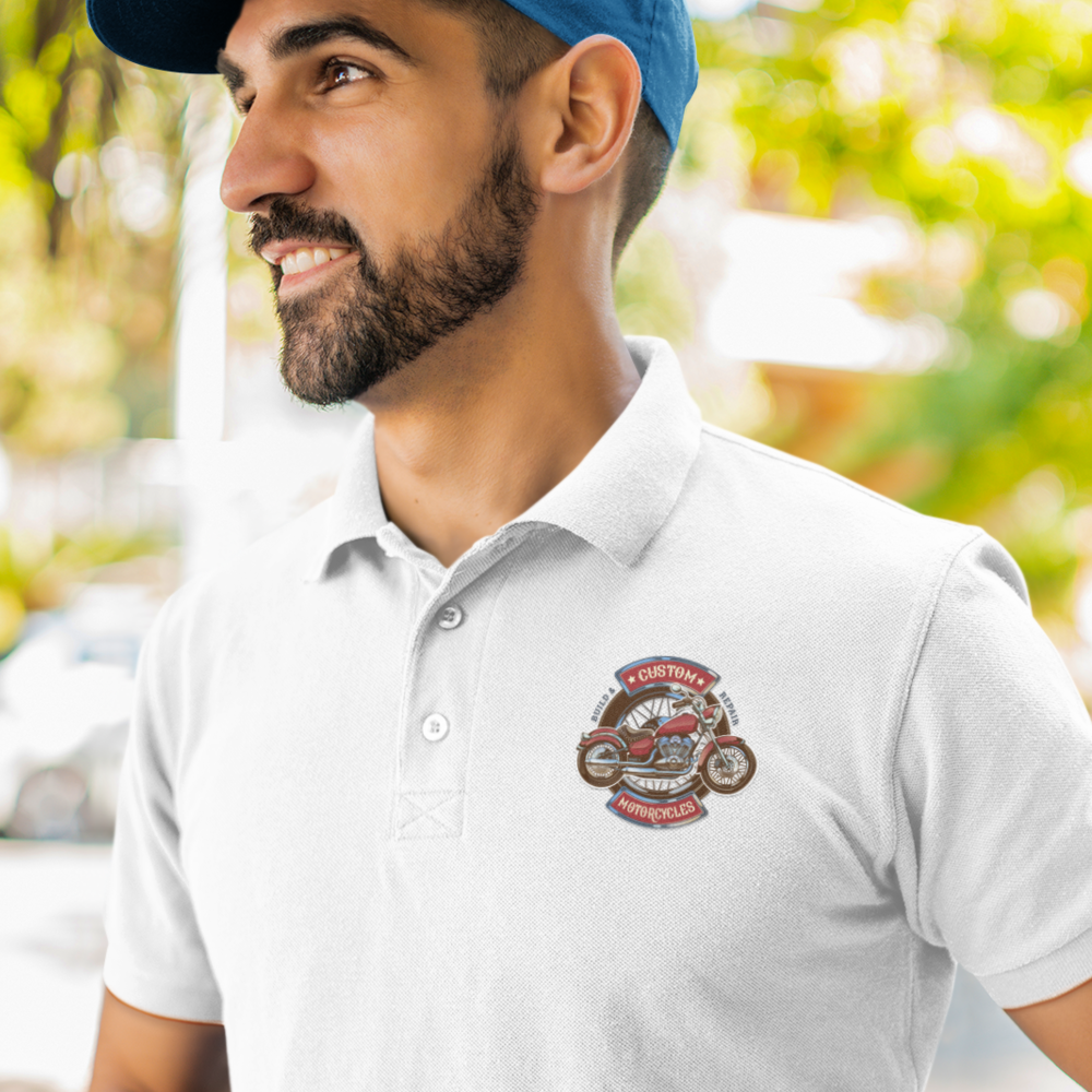 Pensa fuori dagli schemi con la nostra polo personalizzata con il logo di Custom Motorcycles. Mostra la tua passione per le moto con questo capo unico e di alta qualità. Confortevole da indossare e perfetto per qualsiasi occasione, sarai sicuro di distinguerti dalla folla con questa polo esclusiva!
